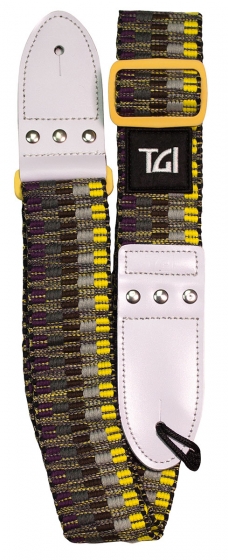 High quality woven cotton guitar strap. Multi coloured with yellow buckle. This strap has white leather ends and an adjustment buckle to adjust the strap length to suit various instruments and playing styles.